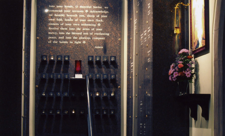 The columbarium chapel was dedicated on November 25, 2001 with forty-nine niches installed on the north wall. Another forty-nine niches were added to the south wall and dedicated on February 22, 2009. Response to the columbarium has been positively robust. We